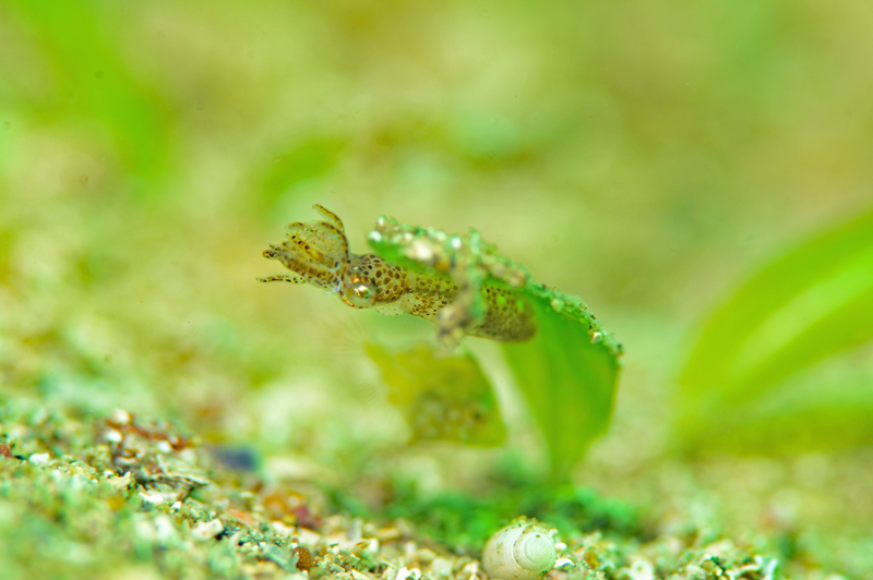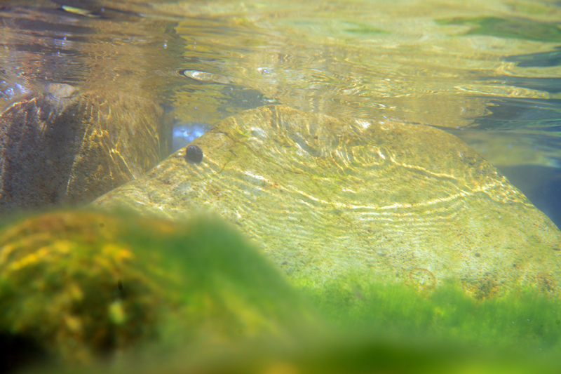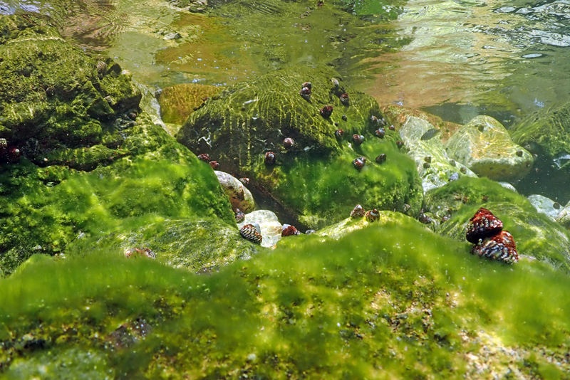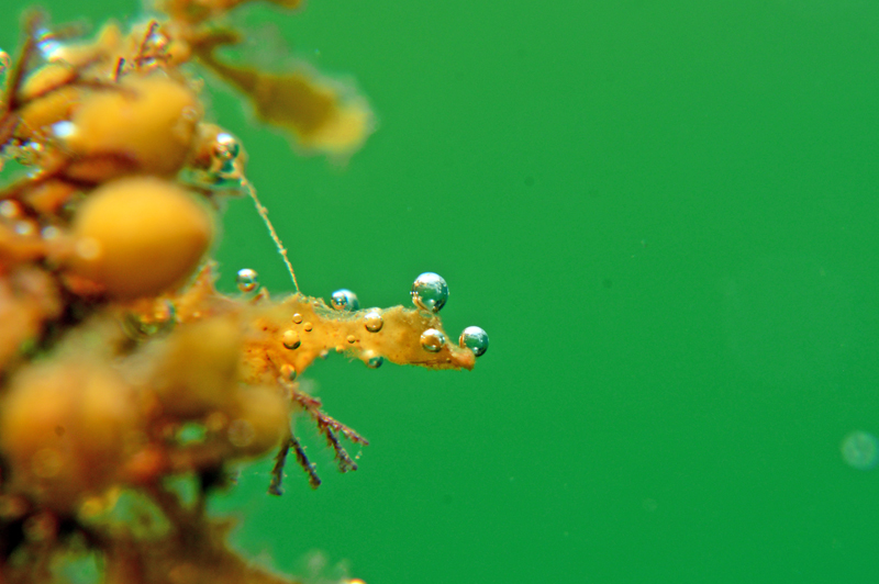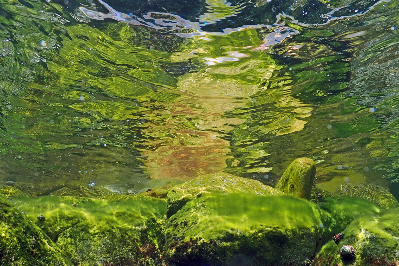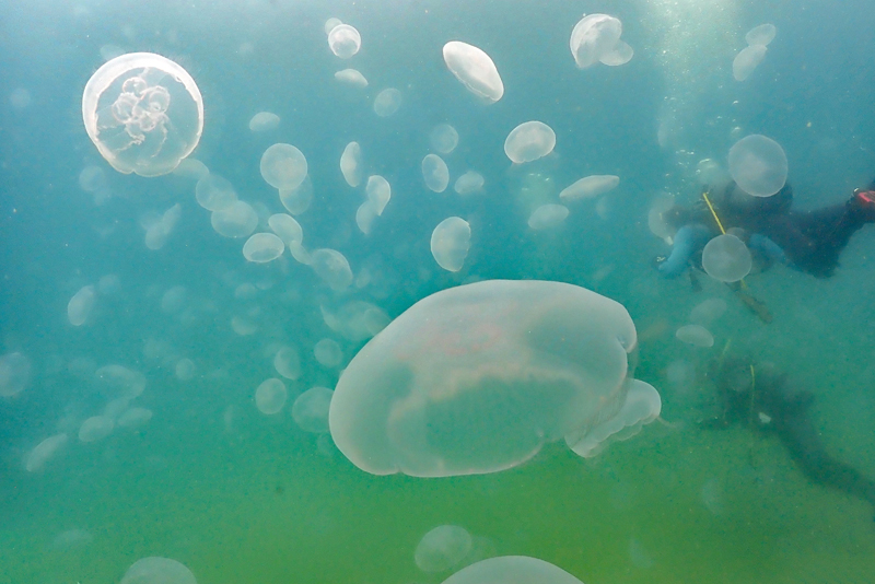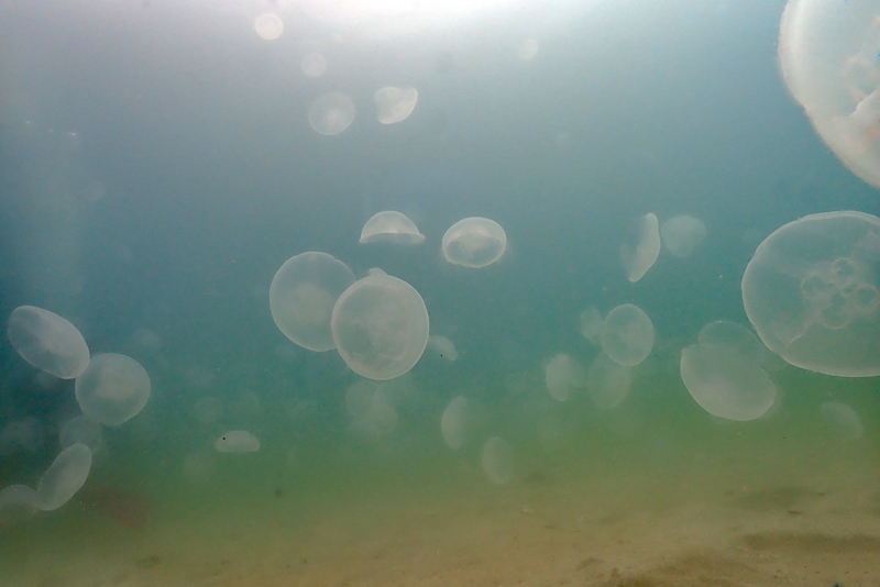 泡と浅瀬の風景と運よくクラゲの大群